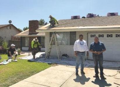 Brothers Hector (left) and Rudy Gutierrez of Shell Roofing in Chino stand in front of the Rodriguez home this week as the roof is undergoing repairs. Champion photo by Brenda Dunkle